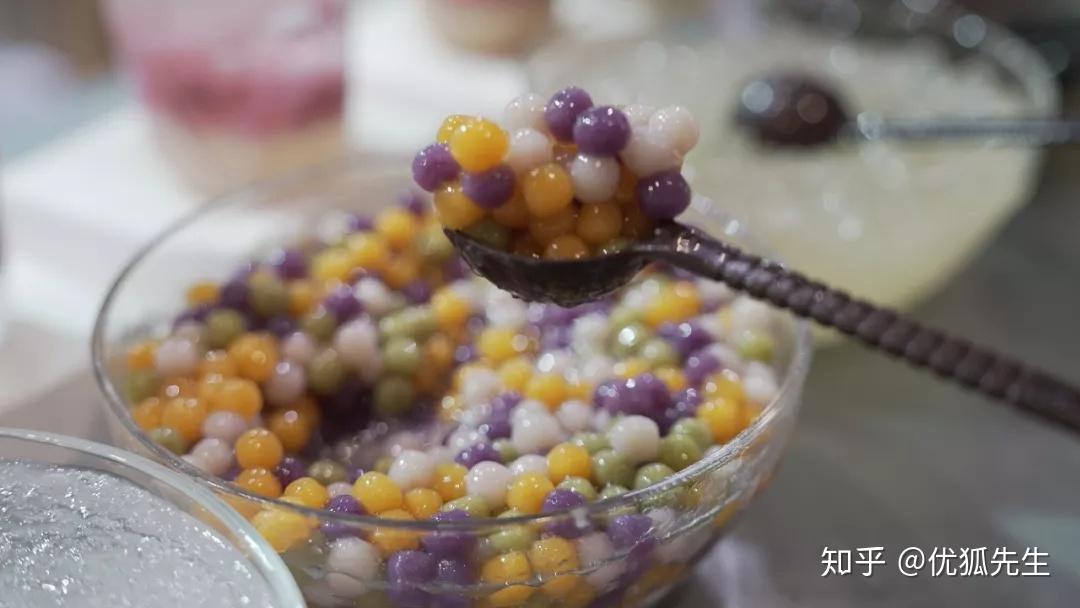 自己隨心所欲搭配,自己動手添加,而且,他們的輔料大部分是我們之前有研發過的原料哦,比如這款五彩小芋圓!