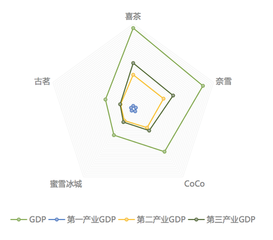 從所開門店城市GDP均值、社會(huì)消費(fèi)品零售總額均值兩個(gè)指標(biāo)來看,喜茶、奈雪通常選址在經(jīng)濟(jì)發(fā)達(dá),且第三產(chǎn)業(yè)GDP遠(yuǎn)遠(yuǎn)優(yōu)于第一二產(chǎn)業(yè),社會(huì)消費(fèi)品零售總額較高的一線新一線城市。而CoCo>蜜雪冰城>古茗,主攻下沉市場,對經(jīng)濟(jì)水平要求相對較低,但也有一定的門檻。