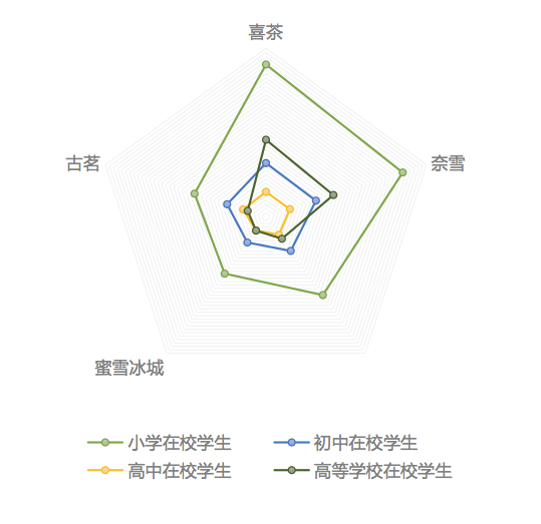 從所開門店城市在校學(xué)生均值來看,喜茶、奈雪通常選址在高校、小學(xué)較多的城市。五個(gè)品牌所入駐城市的初、高中數(shù)量無較大差異。