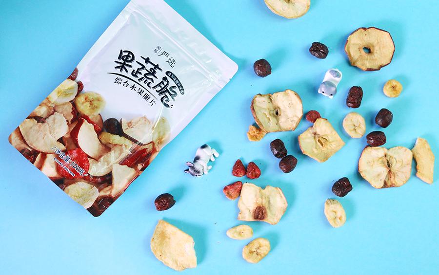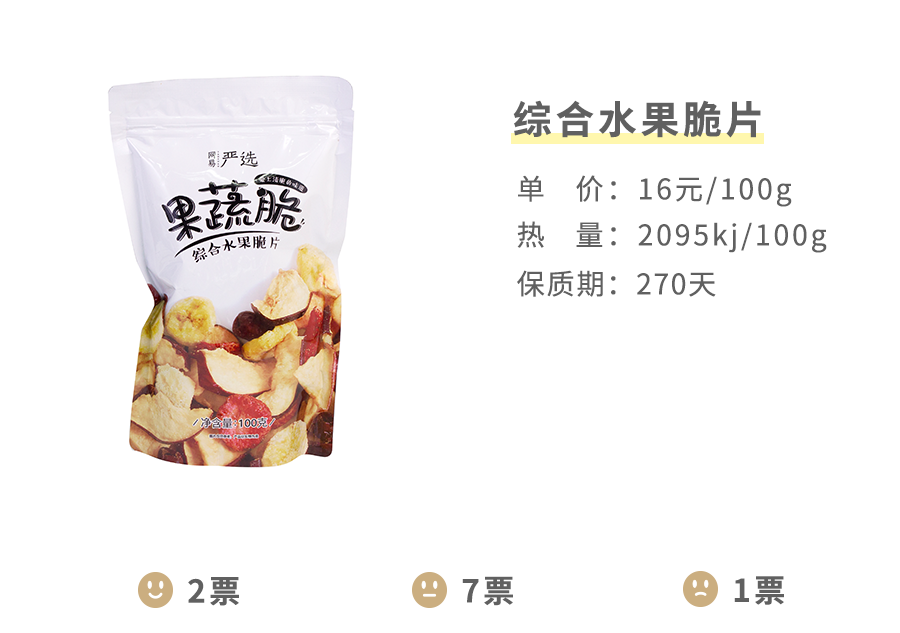 里頭總共是有五種水果脆片,紅棗、香蕉、蘋果、哈密瓜、草莓。不知道是不是炸得有點過頭,水果脆片都不怎么脆,而是發硬的,還稍微有那么點油耗氣。脆片表面甜味太重了,覆蓋掉了水果本身的清香。價格也有點小貴,要不還是再加點錢買凍干的系列吧……更健康也更好吃。
