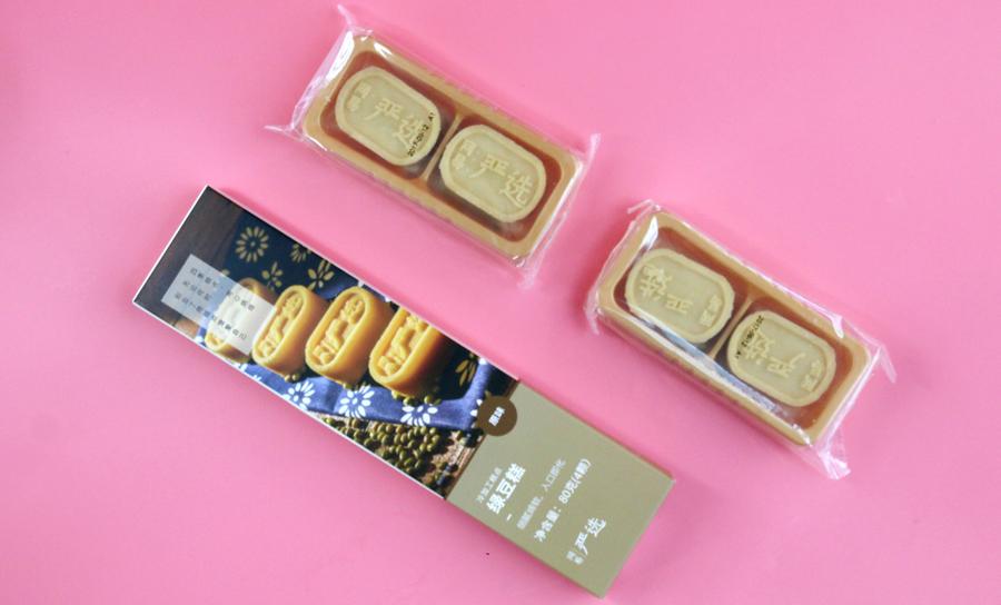 綠豆糕有兩種口味,原味和玫瑰味的。一盒里分兩小包,一包里有兩塊,設計得還是蠻合理的。