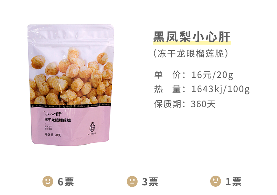 凍干水果算是這兩年的新流行了,比起油炸的果干要健康得多,當然價格也是蹭蹭蹭上去了。榴蓮+龍眼的組合還挺少見,看了下配料表很干凈,無油無添加劑。
