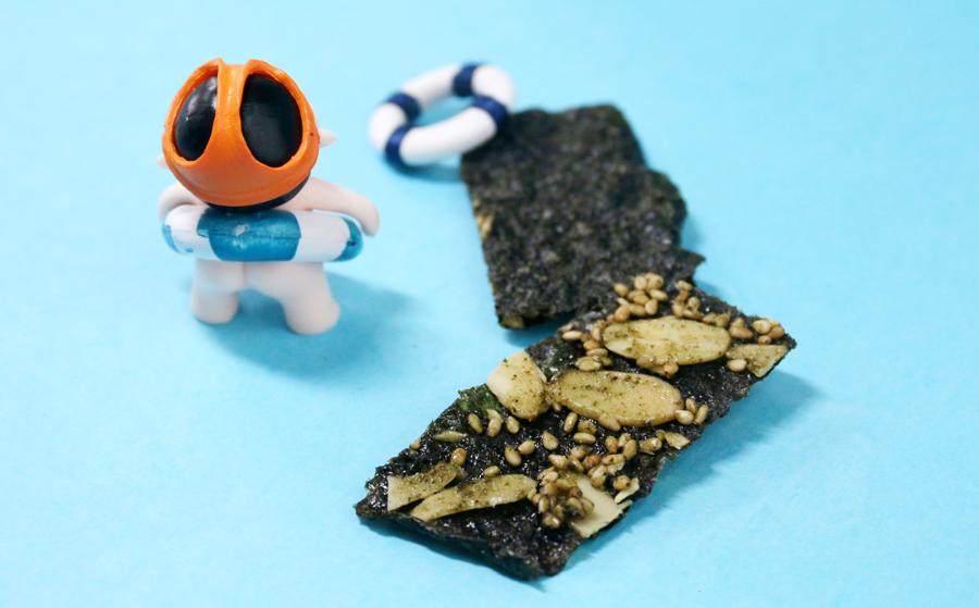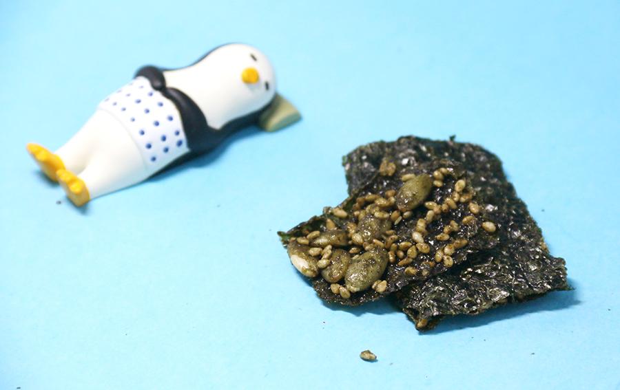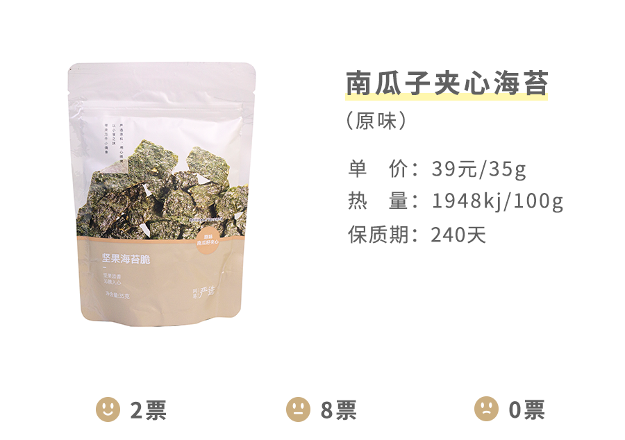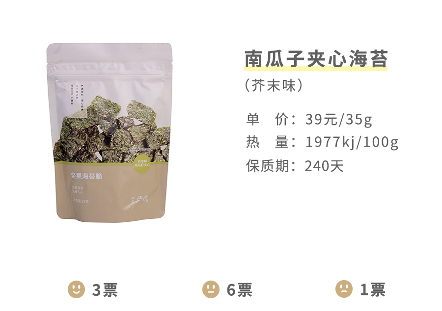 比起巴旦木的那一款夾心海苔,南瓜籽看樣子是遜色不少。總結一下探員們的發言,主要是因為南瓜籽缺少了些堅果的香氣,吃上去還有點發苦。以及,三種口味拍出來照片都長一個樣,那就只擺這么一張吧。