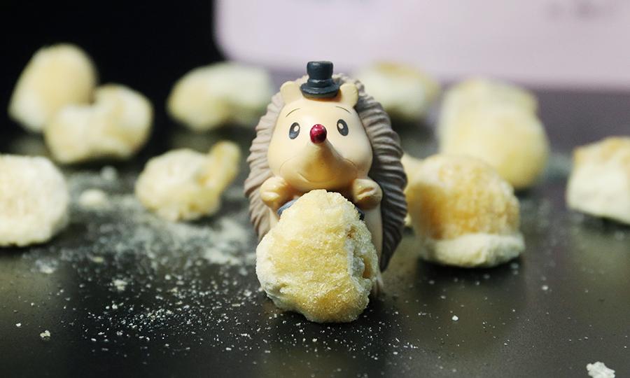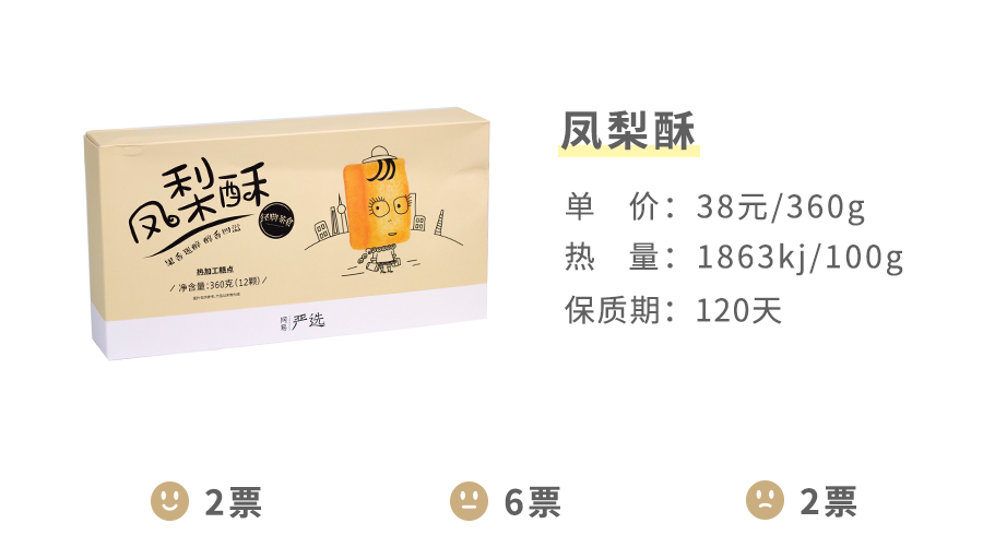 嚴選的這款鳳梨酥特別添加了10%的鳳梨果肉,比起只用冬瓜蓉的自然是要良心不少。然而吃進嘴里,除了酸酸甜甜,只感覺到有些細碎的渣渣,也蠻難分辨自己到底吃的是不是果肉了。酥皮做得偏薄了,表面掉了些渣就能隱約看到里面的餡料了。