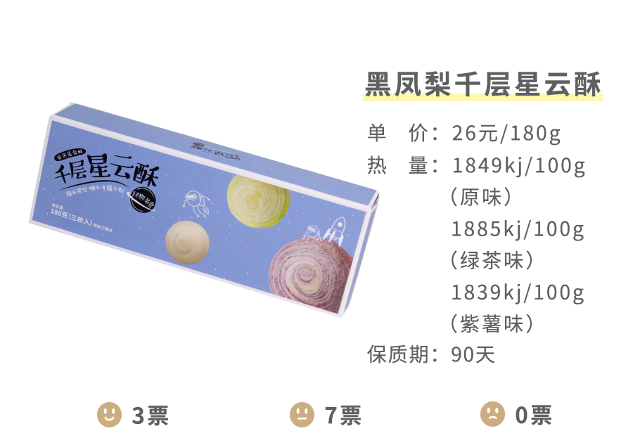 一盒里就三個,26塊錢的價格還是蠻貴的。名氣很唬人啊,都跟宇宙星體攀起親戚了,但其實就和票圈里經常能看到的私房蛋黃酥并無二致。雖然有三種口味,原味、綠茶味、紫薯味,但味道只是體現在了酥皮上,餡料是一毛一樣的。