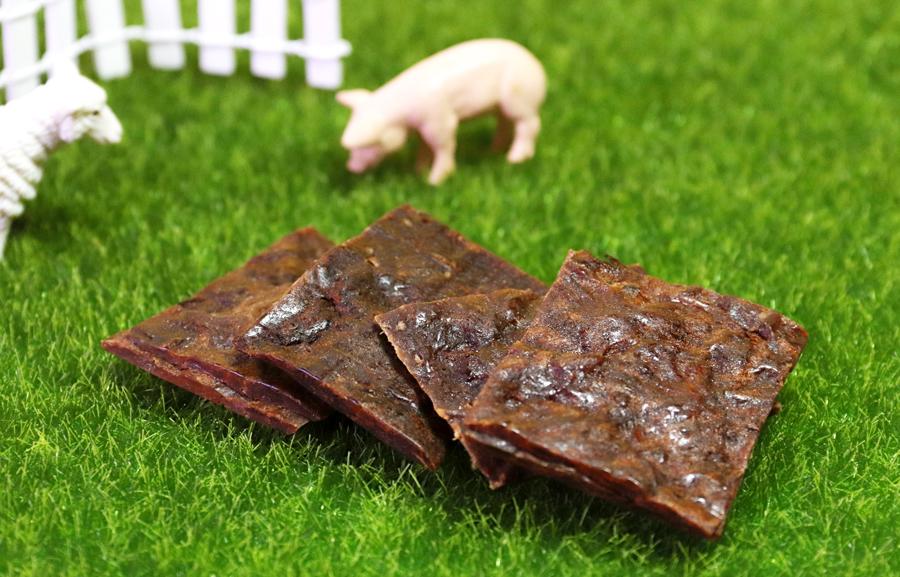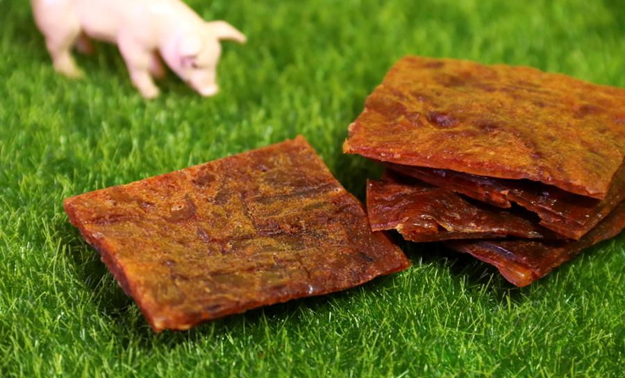 一袋里有18小包,每包里有兩片豬肉脯。不知道是不是真空密封處理的緣故,拆了幾包兩片肉脯都是牢牢地粘在一起的,分開有點難度。看介紹,豬肉脯用的是豬后腿肉完整切片,不加肉糜混合,難怪有探員表示這款豬肉脯吃上去“肉感”更豐富。烤制時油量應該也有所控制,所以要比一般的豬肉脯更干燥,不會吃得一嘴油光。